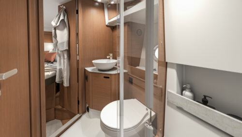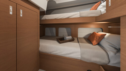The standard inboard Yanmar 6LY 400cv engine with 212 Gal fuel tank offers a range of 350NM at 8 knots cruising (with a 10% fuel reserve). The power can be increased to 440cv.