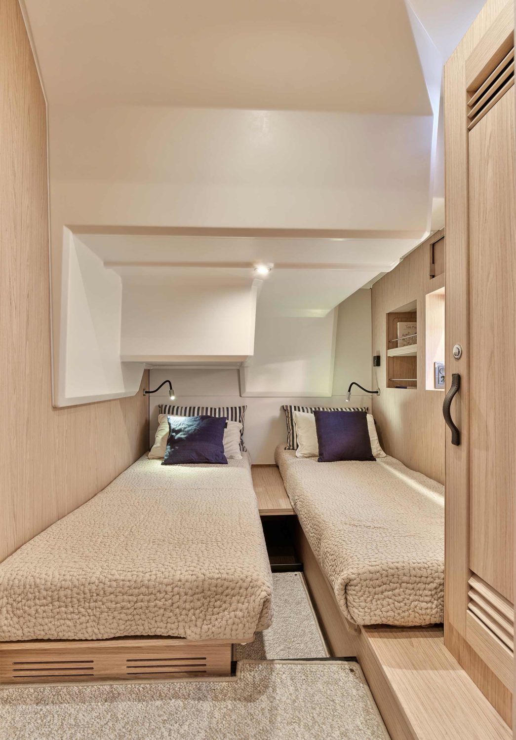Truly feel at home on the water with three cabins in the lower accommodations and easily transform the salon dinette for additional space if needed. The forward master cabin offers a comfortable double berth with an ensuite and separate shower. The portside guest cabin offers two single berths with an infill to convert into a double berth, a connected ensuite door to the portside day head. The starboard guest cabin features a double berth with storage including space for an optional washer/dryer.