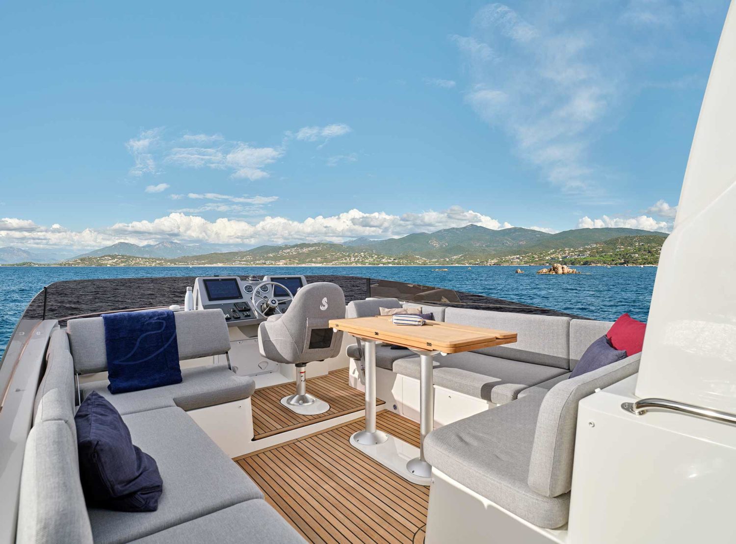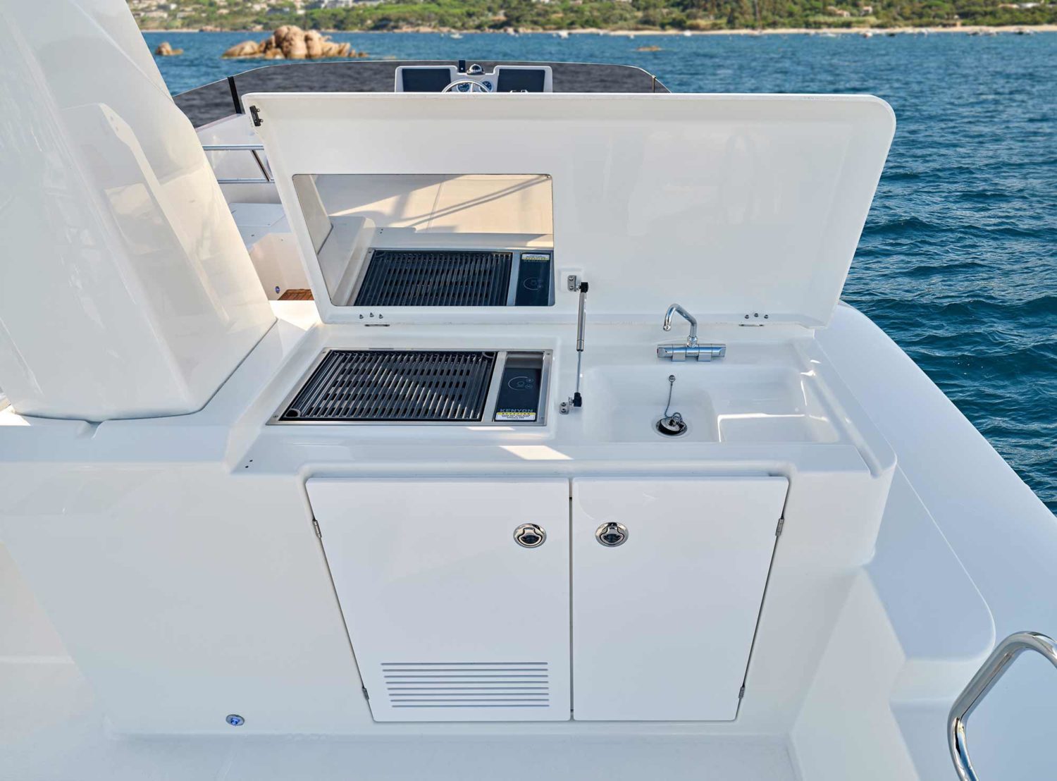 The BENETEAU Swift Trawler 48 is the largest Swift Trawler with an overall length of 48’4”. The flybridge provides a comfortable and relaxing space to gather while enjoying panoramic views. Coming down the flybridge stairs into the aft cockpit, ample space is provided for a table with folding chairs. A transom double provides access to a large swim platform with an optional hydraulic lifting system perfect for carrying water toys or tenders. Inside, a large L-shaped galley features a standard gas oven, a clever “magic corner” pull-out storage unit, and cupboards & drawers with ample storage space.