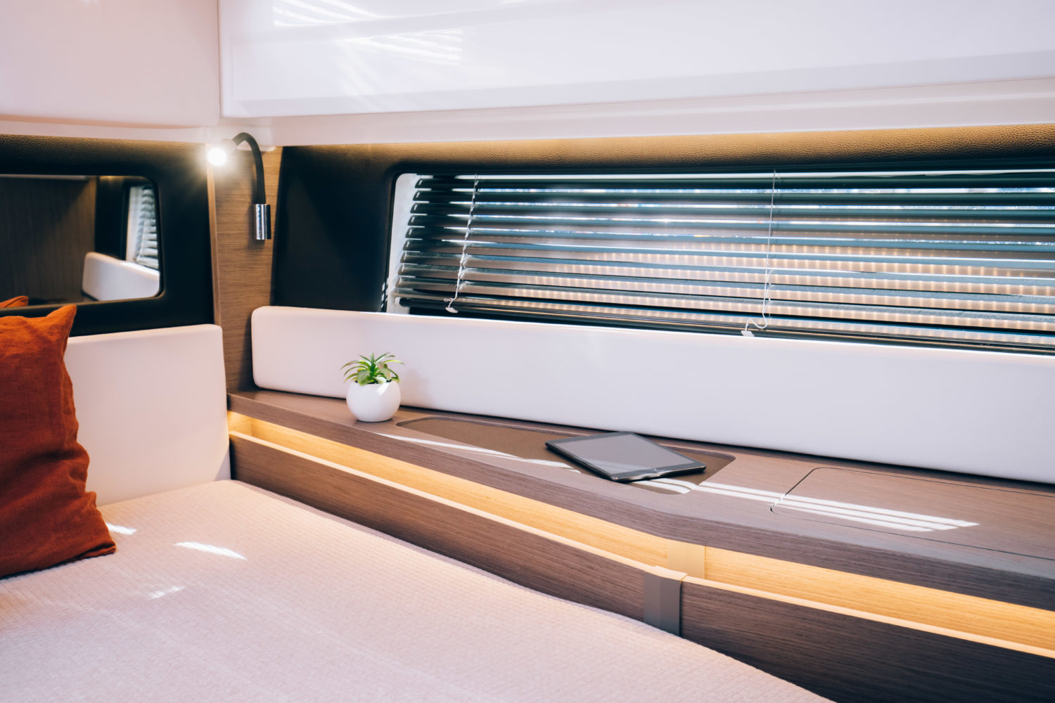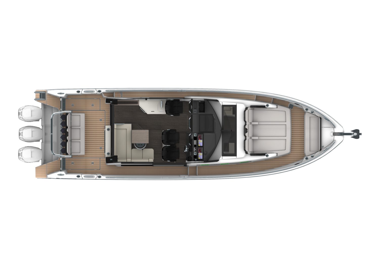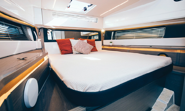 The spacious wheelhouse provides comfort for five while cruising along, with three seats in the cockpit for support during more challenging navigation. A door at the helm grants convenient communication between the front and rear cockpits, while the two large side doors enable access to either side of the transom. Three large forward-facing sunbathers in the bow are covered in specialized fabric to maintain surface temperatures in even the strongest of sunlight. Spacious storage lockers with drainage, comfortable bench seats, and a removable table welcome guests to enjoy time afloat. Down below, a plush queen-sized bed, a three-piece bathroom with a separate shower, and plenty of storage offer comfortable accommodations for nights on the water.