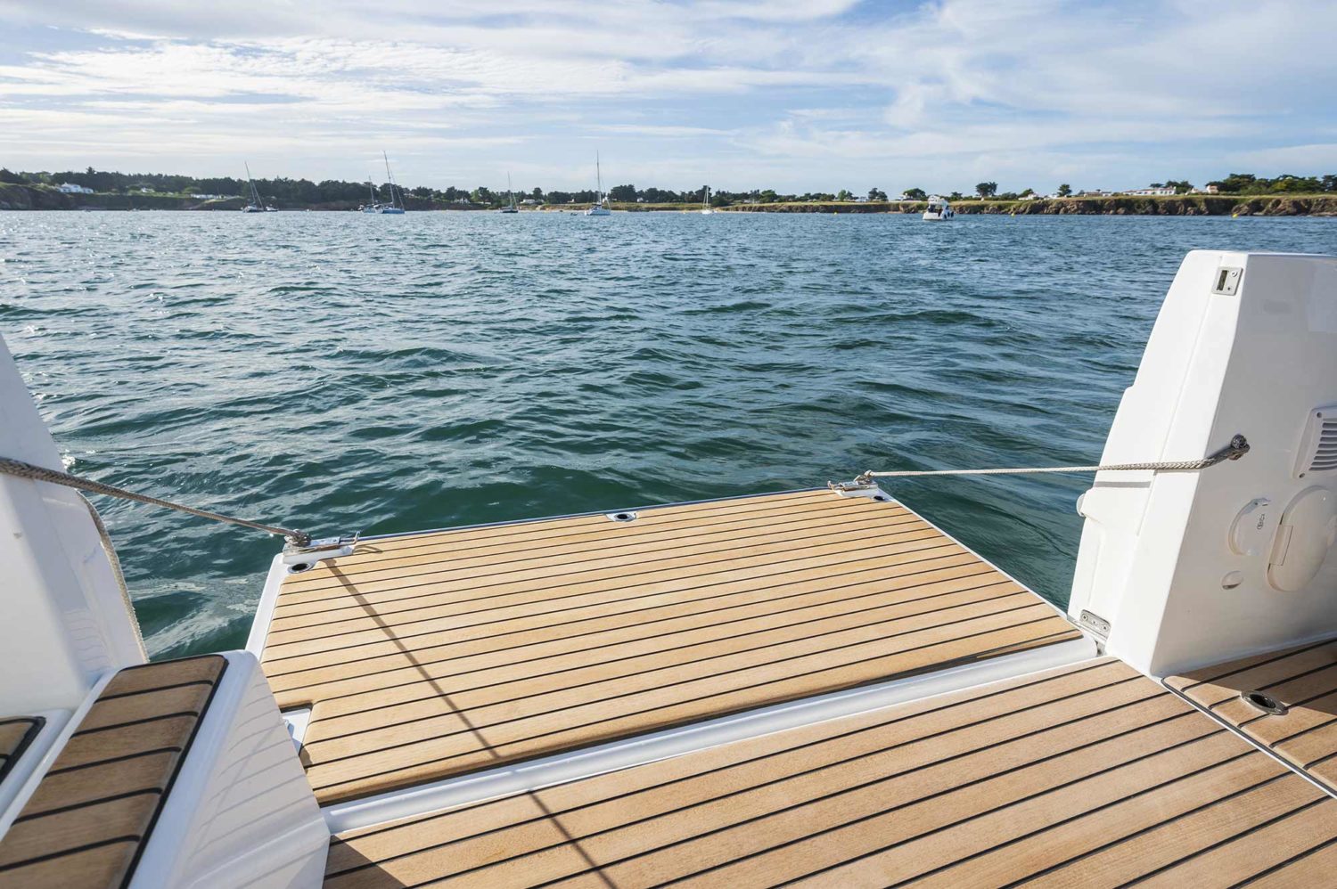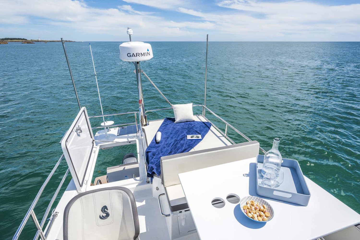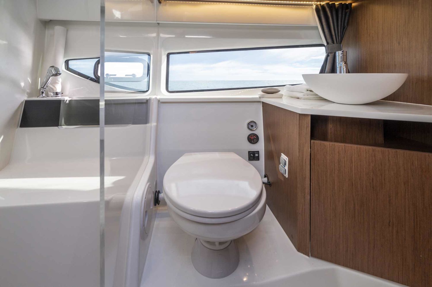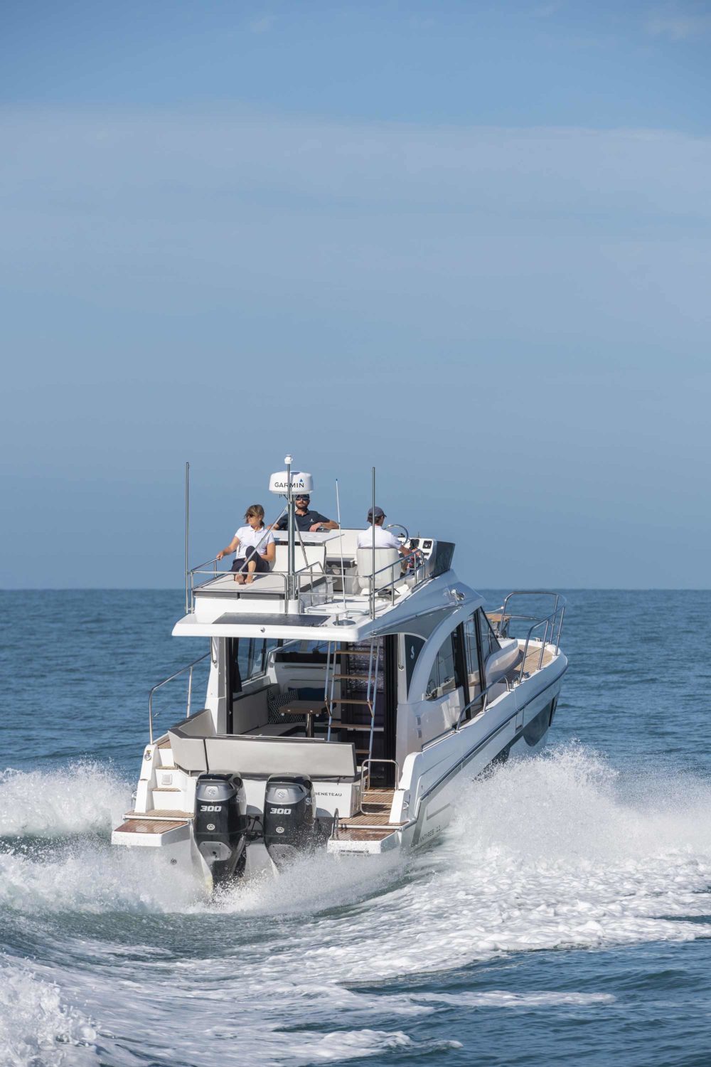 The BENETEAU Antares 11 is the largest cruiser in the Antares fleet and focuses on the core values of comfort, space, and safety. Twin Mercury 300 V-8s pair perfectly with the hull, offering a smooth, dry and efficient ride. An optional joystick piloting allows the Antares 11 to be nimble even in the tightest of marinas. An aft sun bench, side swim platform creating a sea-view terrace, and forward sun pad provide the perfect spots to enjoy the days’ activities. Natural light fills the spacious wheelhouse from surrounding windows. A port side table with seating for up to four offers a great space to gather to relax. Below deck, a well-appointed double master cabin offers a central island bed with ample storage, and an ensuite bathroom. A full-beam aft cabin features a double bed and single berth, in addition to the easily convertible salon settee. The flybridge is fitted with a starboard helm station with optional electronics. Two benches on the port side, along with an aft sun pad, create an open-air salon. An optional refrigerator can be added, making the flybridge an extremely popular destination itself.
