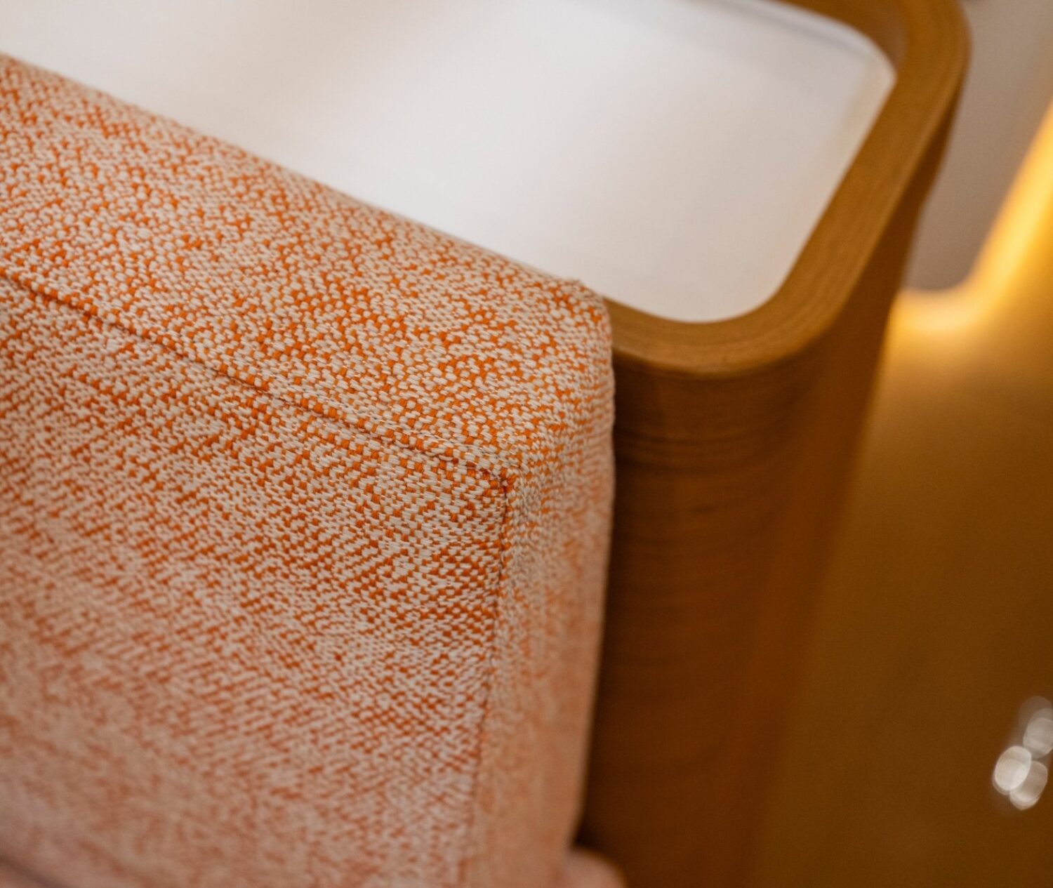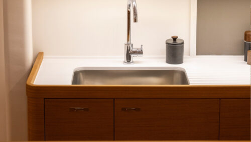 The interior of the FIRST 60 offers a spacious, refined layout, with every detail designed to enhance the pleasure of life at sea. Below deck, a cosy dining area faces the owner’s corner, complete with a generous navigation table and sofa. The full-beam galley, with its elongated worktop and integrated storage, ensures effortless efficiency under sail. A standout feature is the owner’s cabin, which boasts a large walk-around, forward-facing bed, abundant natural light, and calming views of the sea.