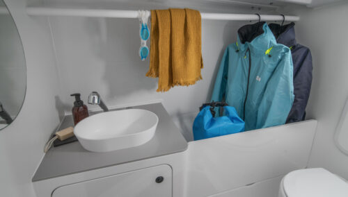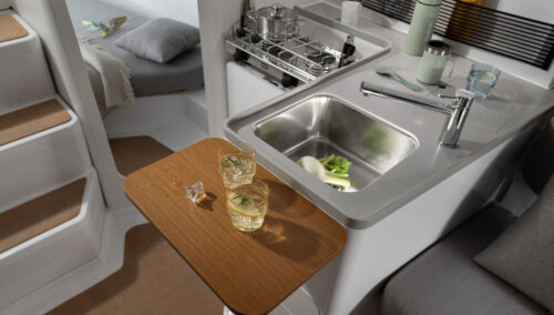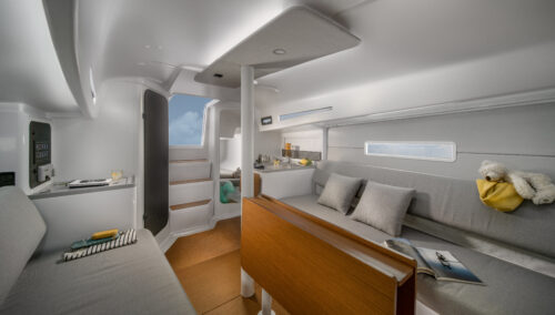 The deck and generously sized cockpit layout were designed with two goals: minimizing clutter to create a spacious and comfortable chill-out area while ensuring outstanding sailing ergonomics. Two cockpit layouts are available: one for day sailors and cruisers and another for racers. In the cruising layout, the mainsail bridle and German sheet system enable the cockpit floor to be completely clean while allowing easy control of the mainsail through generously sized winches.