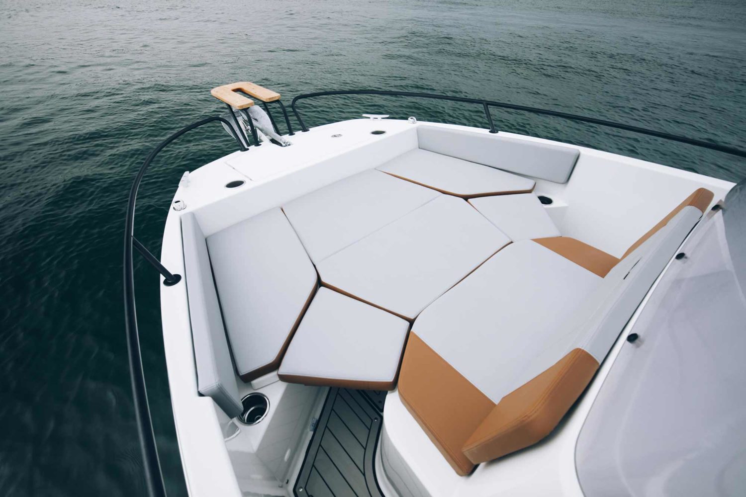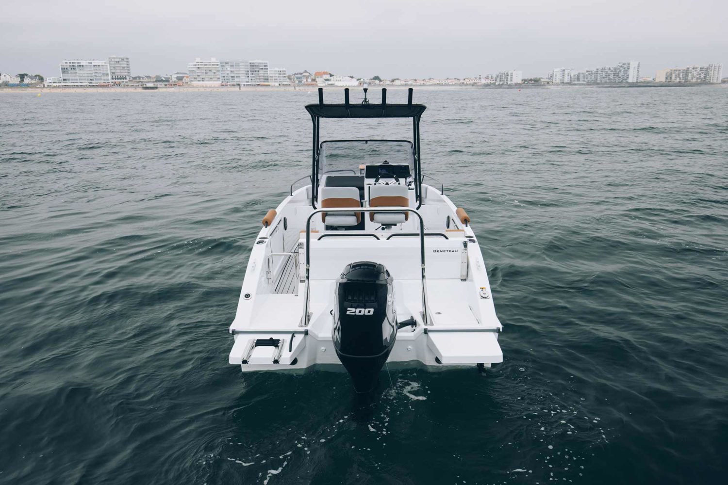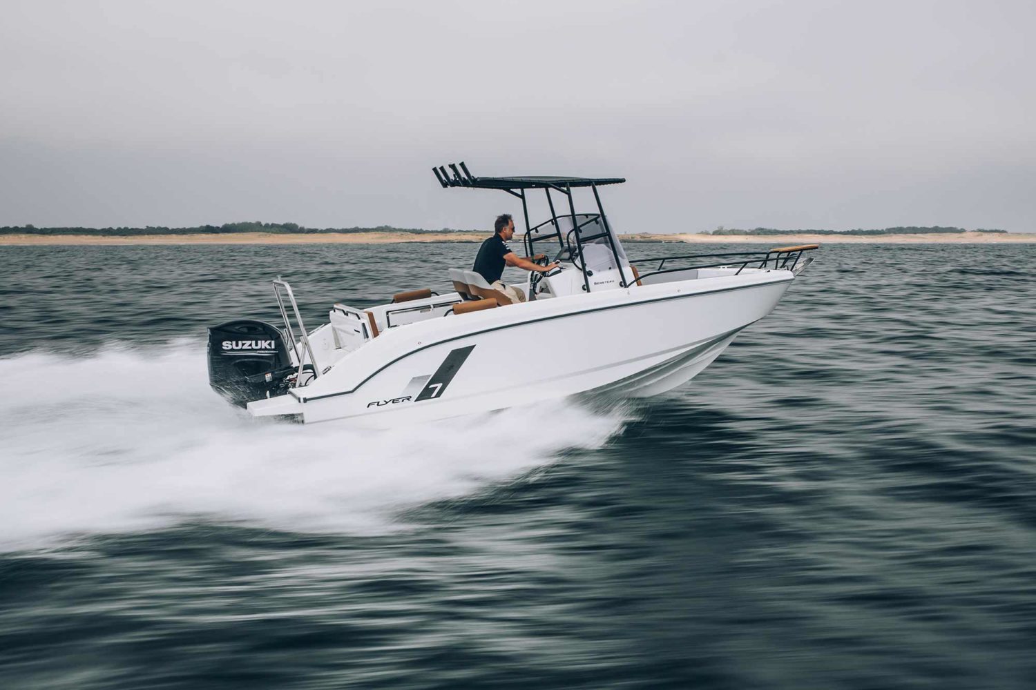 The BENETEAU Flyer 7 SPACEdeck is the ideal solution for unlimited leisure activities including wakeboarding, surfing, fishing, and swimming. The hull of the Flyer 7 is equipped with the latest Air step technology, optimized for these outboards. Space on board allows comfortable seating for up to nine people and has been optimized to provide ample storage space and a large sun pad space.