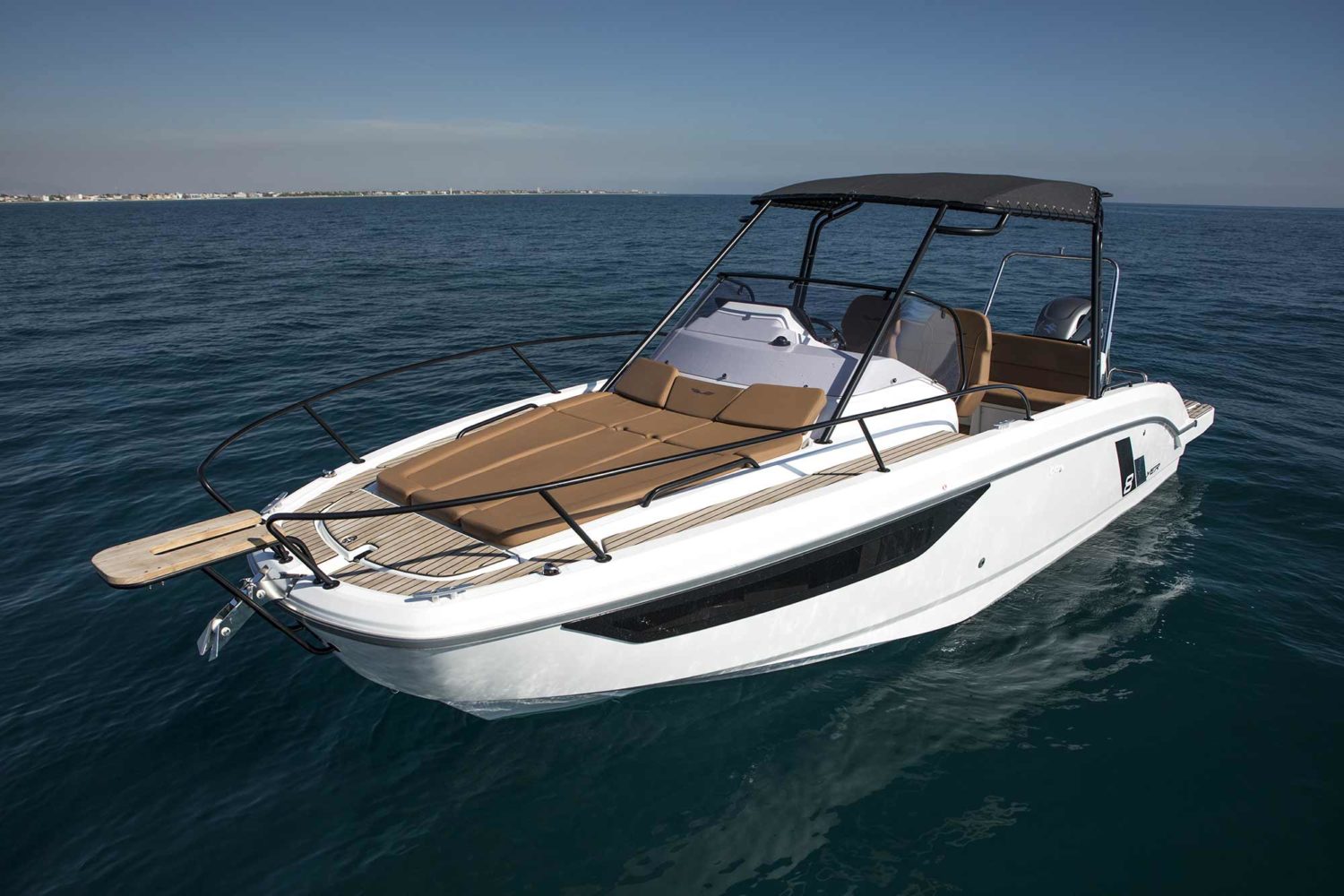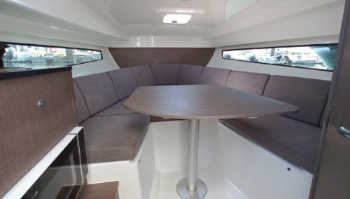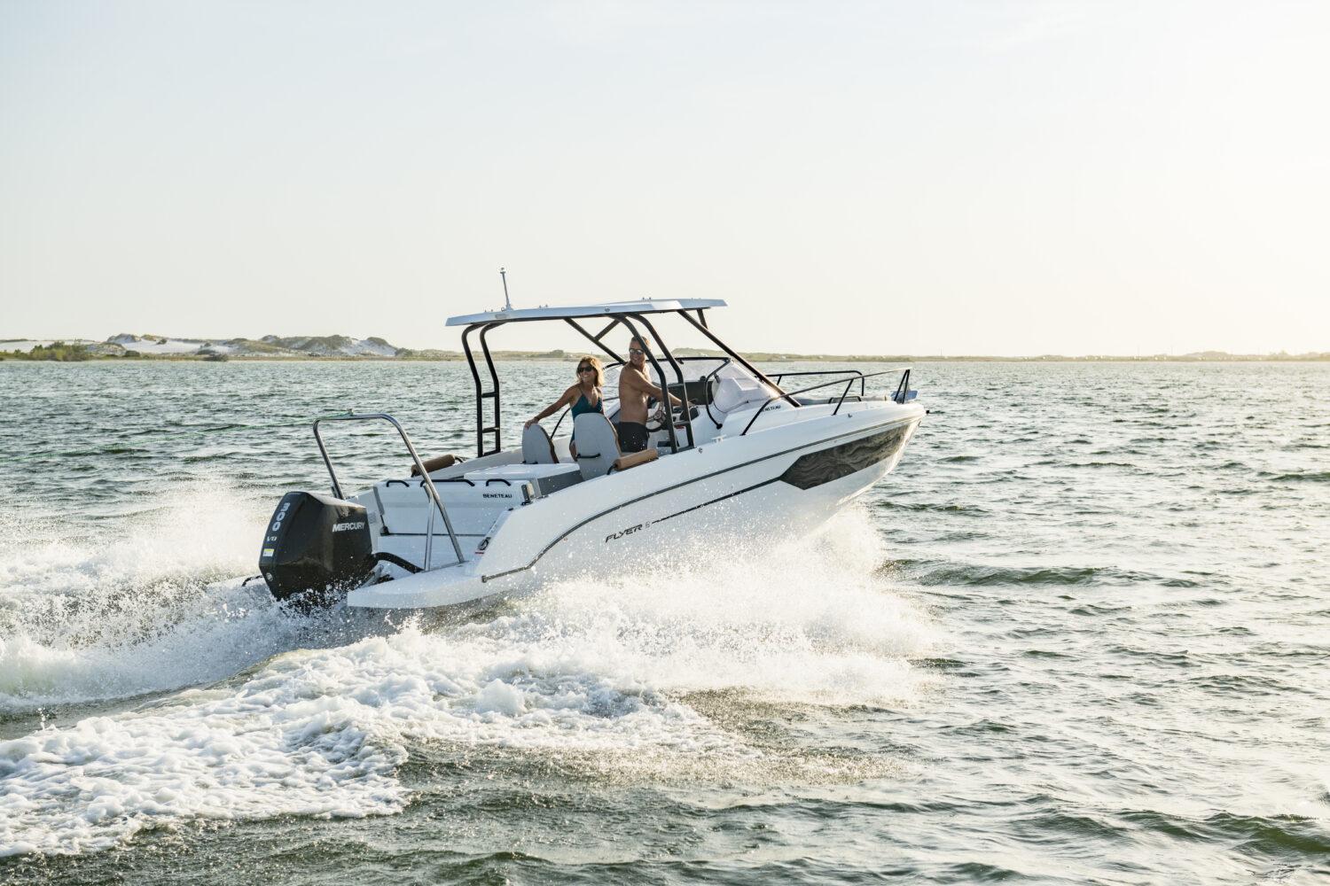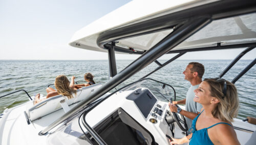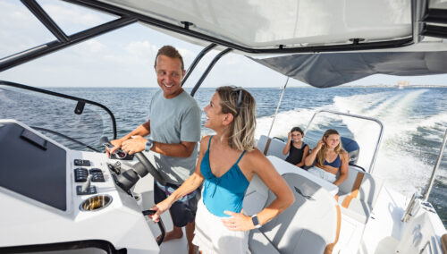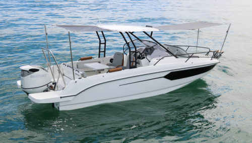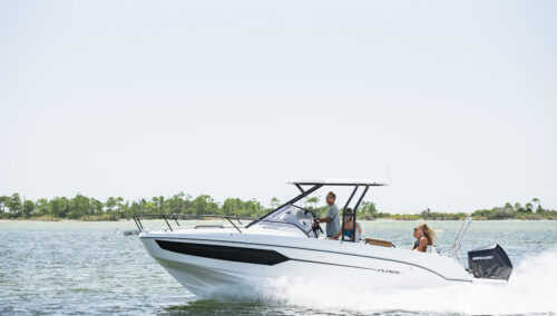 The BENETEAU Flyer 8 SUNdeck is perfect for a weekend getaway and combines comfort, open space and flexibility. Ideal for all-day boating, she’s ready for water sports, fishing trips, sunbathing or picnicking on board, and accommodations to spend a few more days on the water. Access to the forward sun pad utilizing port and starboard walkways. A double-berth cabin down below offers an incredible headroom along with a separate head and a small galley.