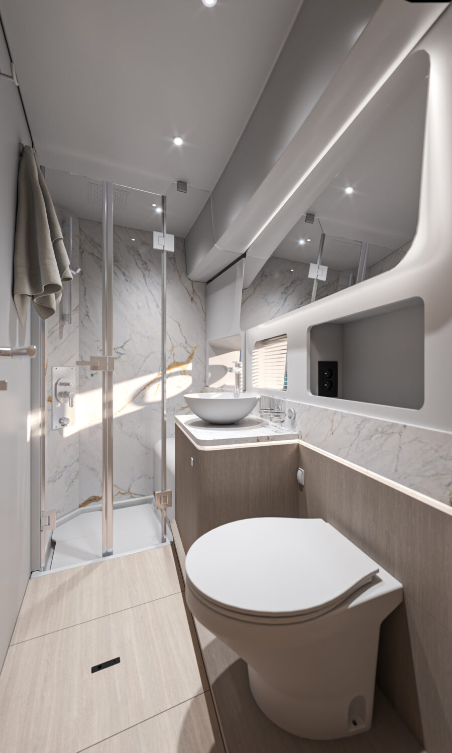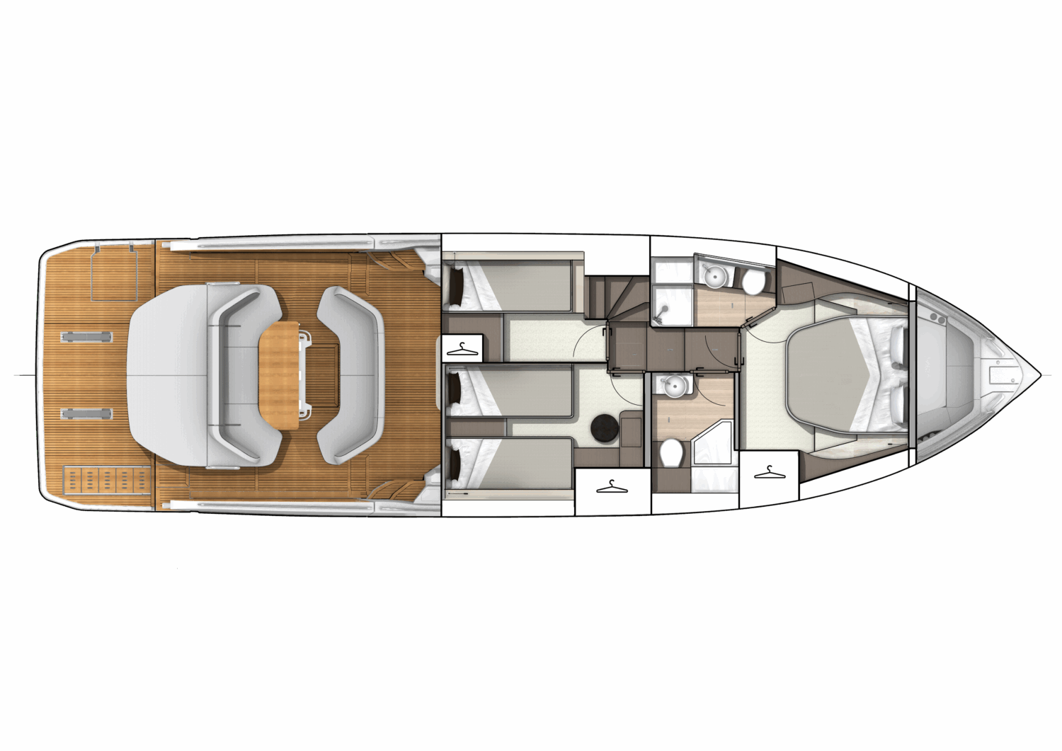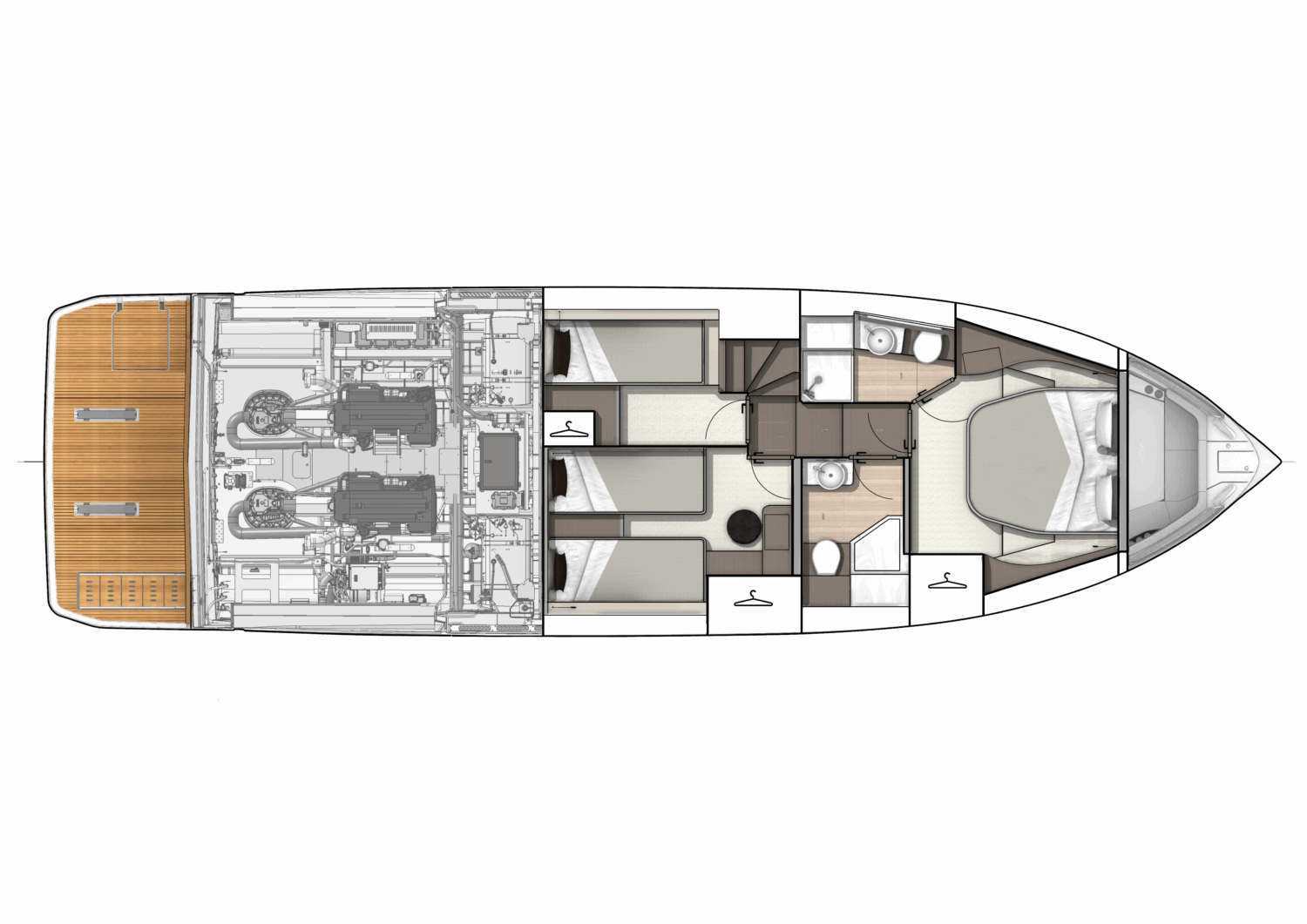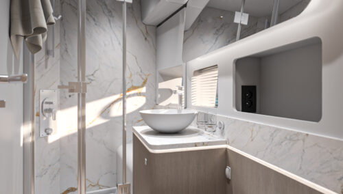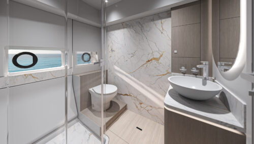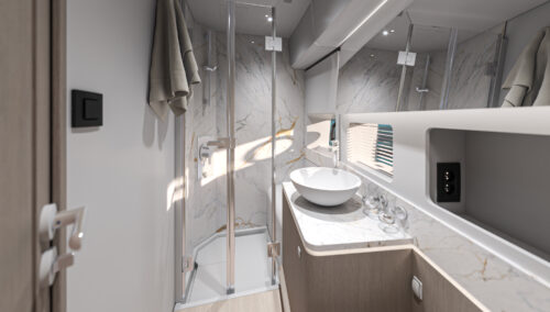If this flagship’s exterior design can satisfy any mood, its stately interior is clearly a place of peace, combining serene colorways and materials with an exquisite study in physical comfort. The brand’s 140+ years of boatbuilding experience are on evident display, whether your attention lingers on the lighting, the volumes, the ergonomics, or simply the overall fit and finish. Living aboard becomes just living, and that’s the way it should be.