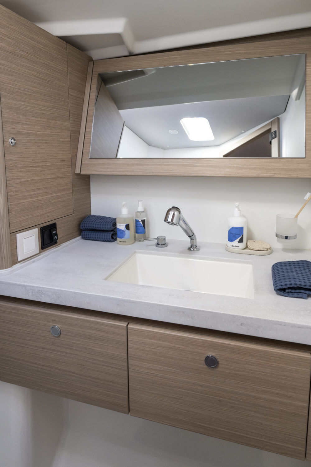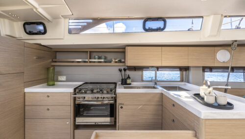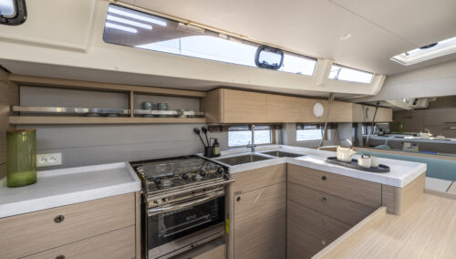 Descend the elegantly sloped companionway and enter a salon designed for comfort, gathering, and easy living. The galley flows into the salon in a way that keeps cook and guests connected — with a full-height refrigerator, Corian countertops, abundant storage, and an optional second fridge for longer passages.