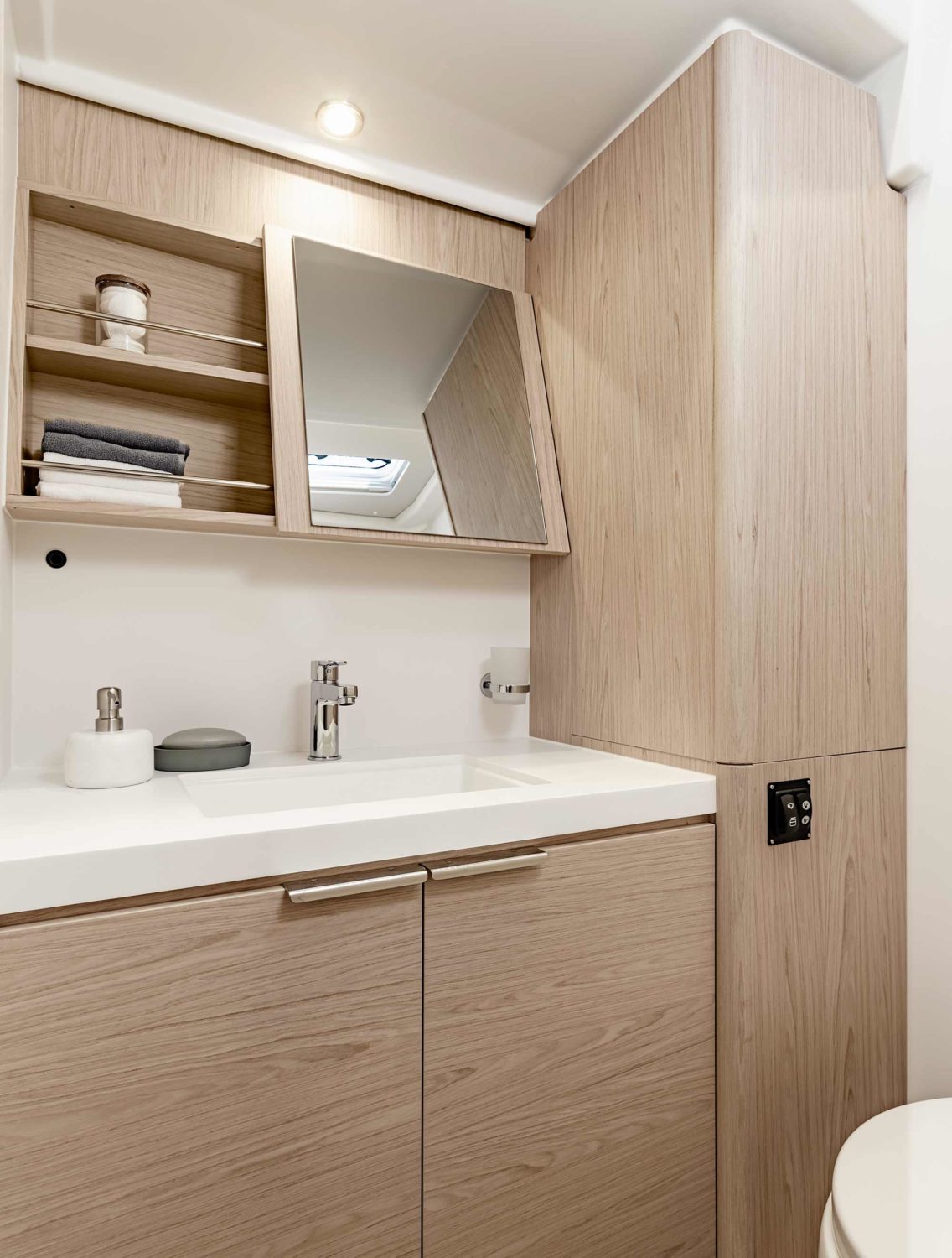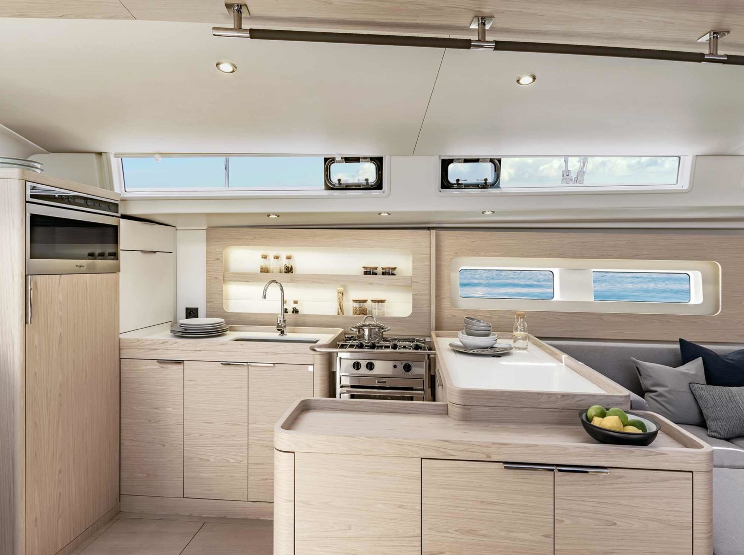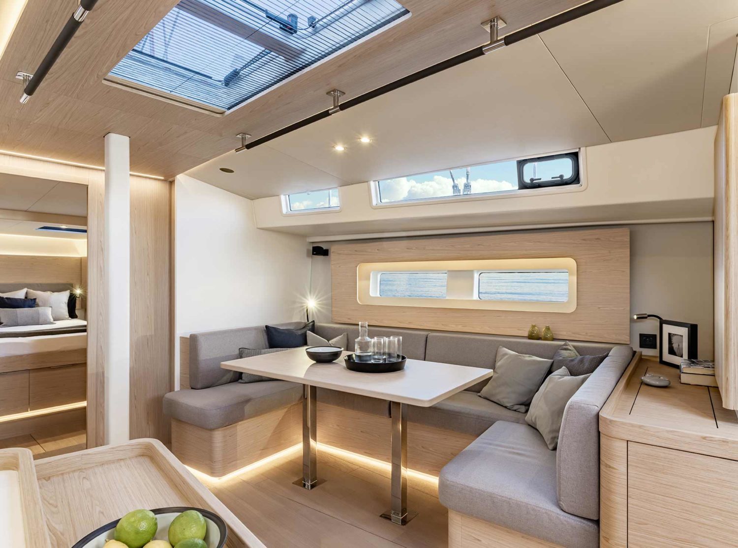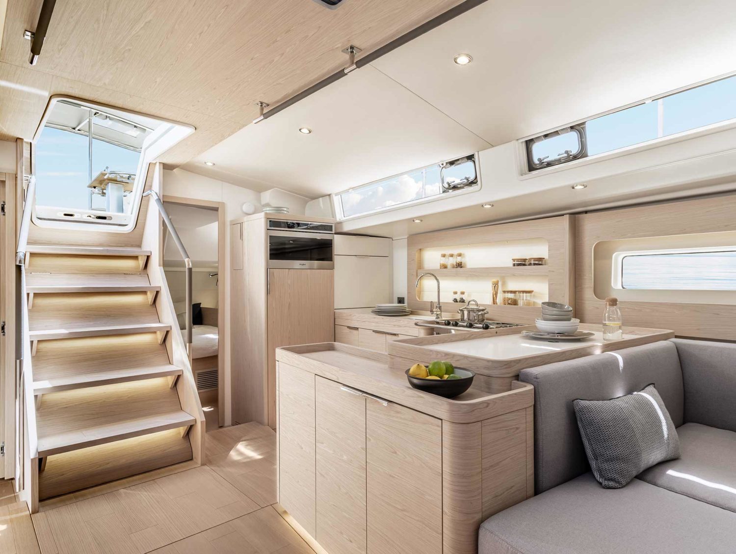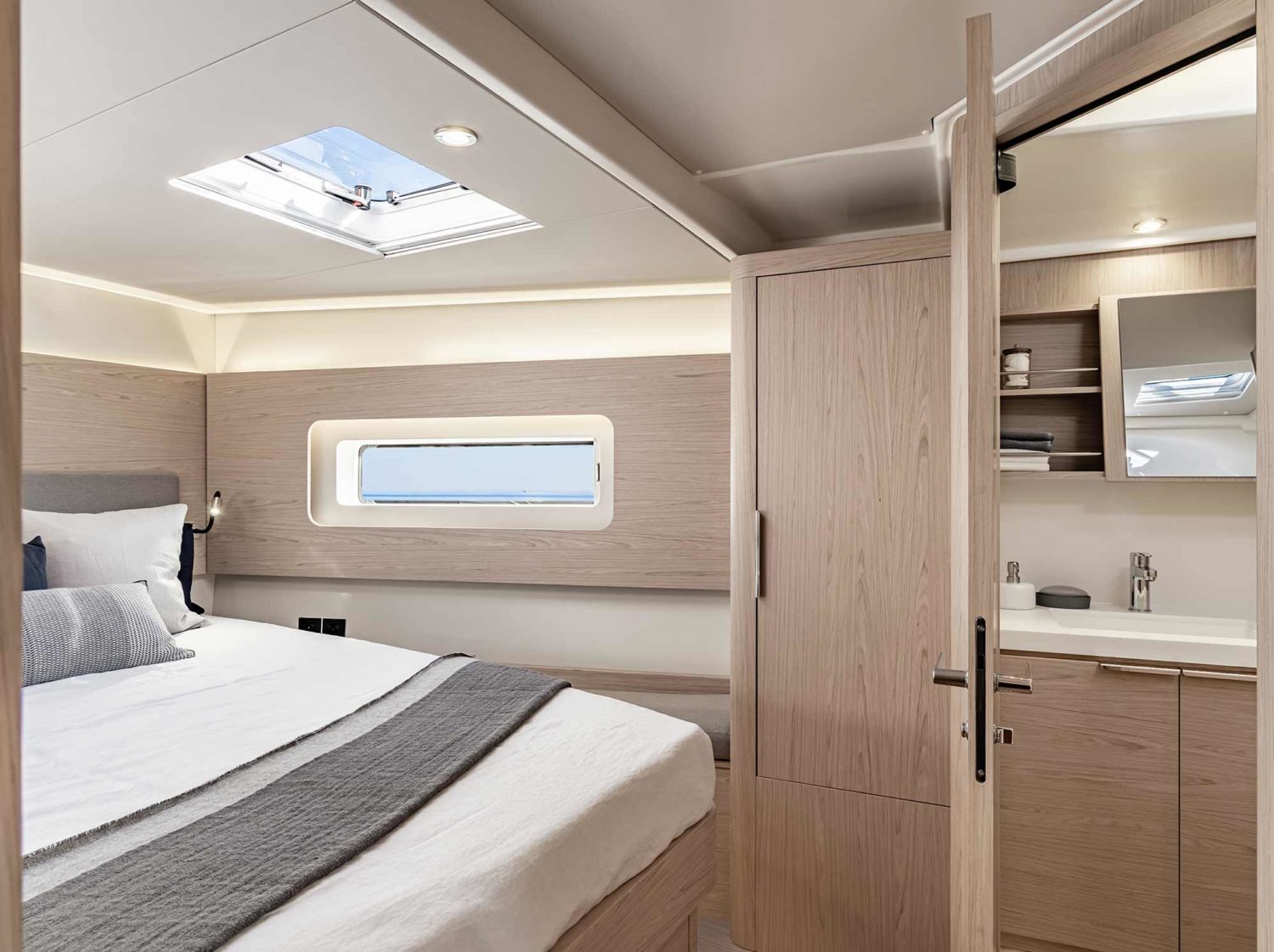 A warm and modern interior welcomes you below deck, matched with the amenities and space found at home. Finding your favorite spot to relax will be a breeze with a dedicated chart table with lounge-style seating and a large bright saloon with windows strategically placed to provide views of the sea at every angle. Choose between a three-cabin, two-head, or a three-cabin, three-head layout.