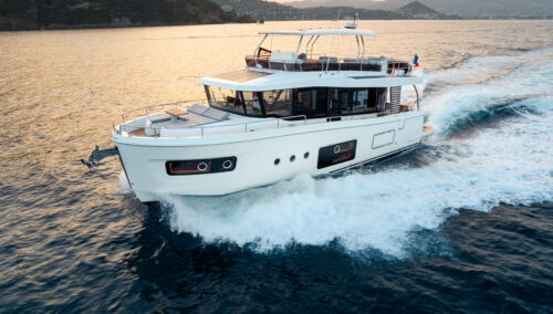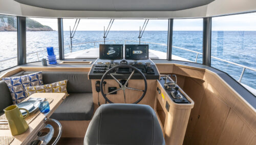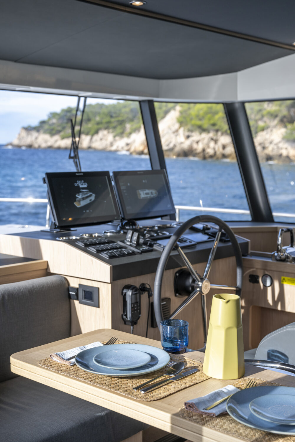 The gentle “S” sheerline line that rises towards the bow gives the hull a purposeful, timeless stance. The clean low profile flybridge above the continuous glass superstructure gives an overall lightness while retaining all the strength needed for a true passagemaker.