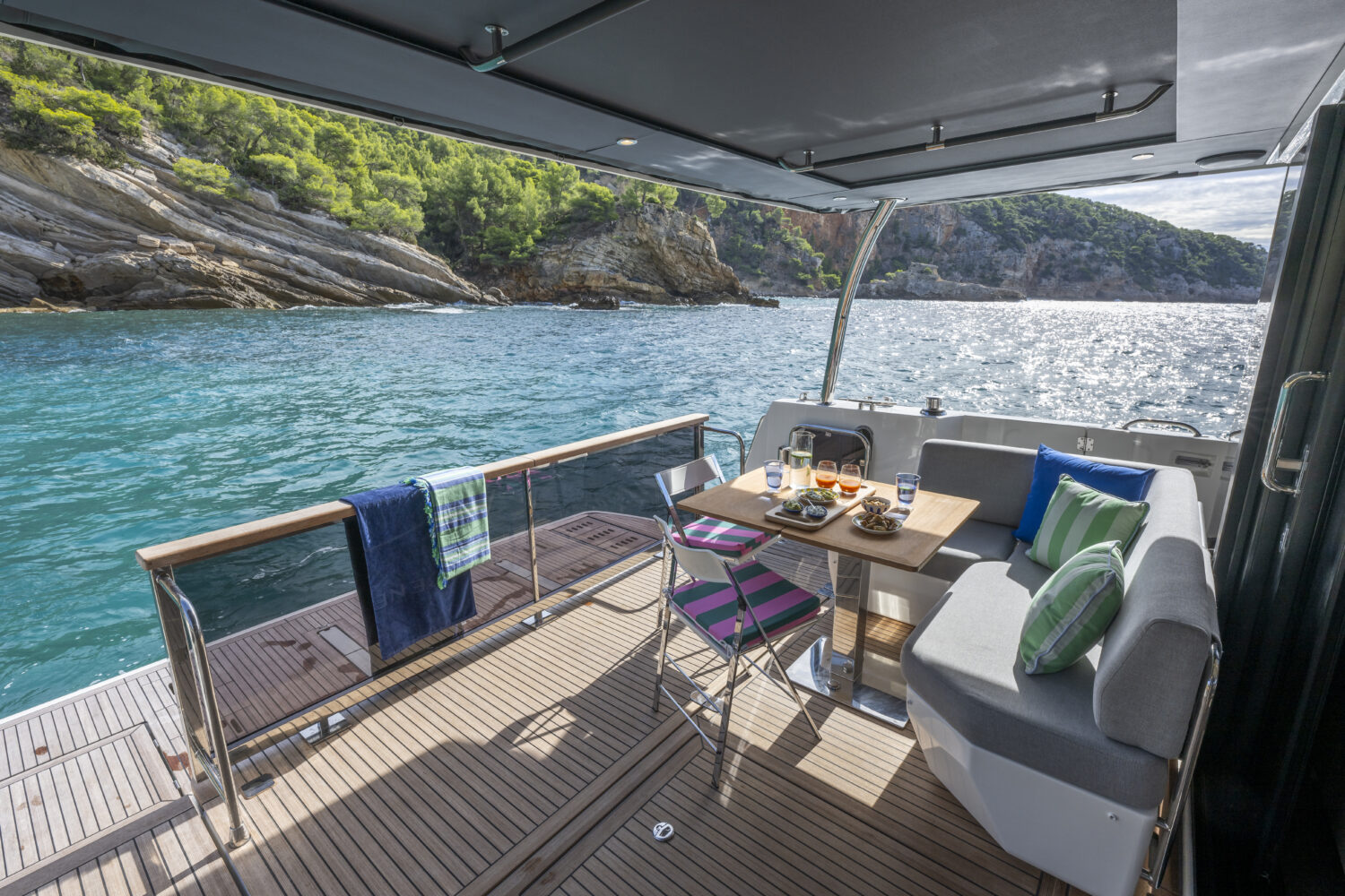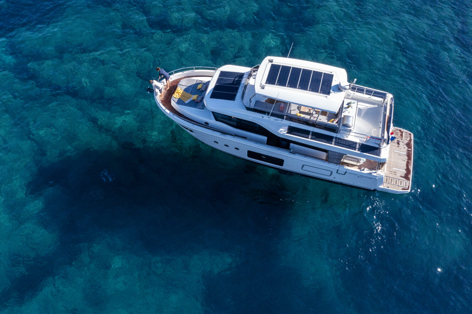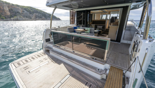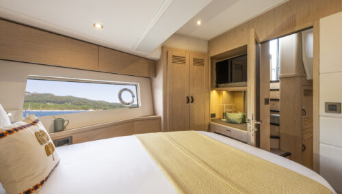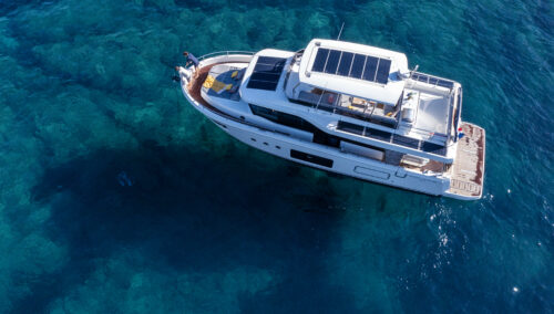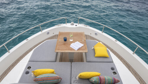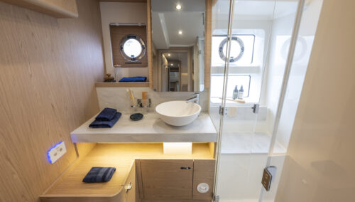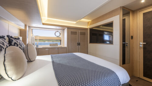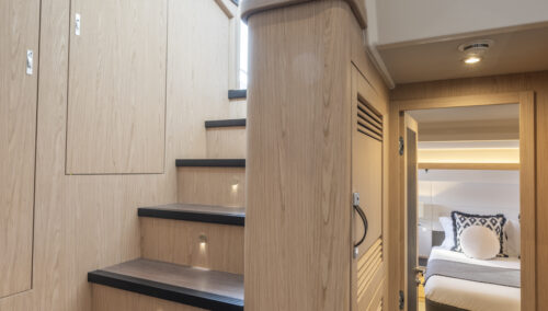 The visually stunning interior environment boasts a well-appointed galley with a raised passagemaker dinette, a large saloon and an attractive “architectural” flybridge stair. Built with six berths, with the option for an additional single crew berth, the layout is perfect for long family cruises. The separate shower cubicles feature Corian flooring with the addition of a rain shower in the ensuite of the full beam aft owner cabin.