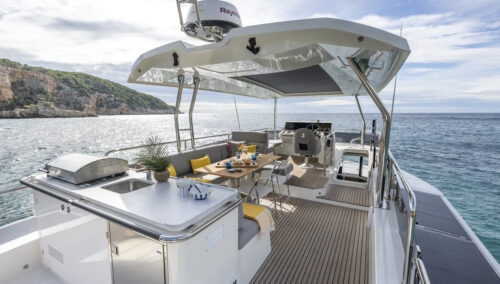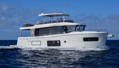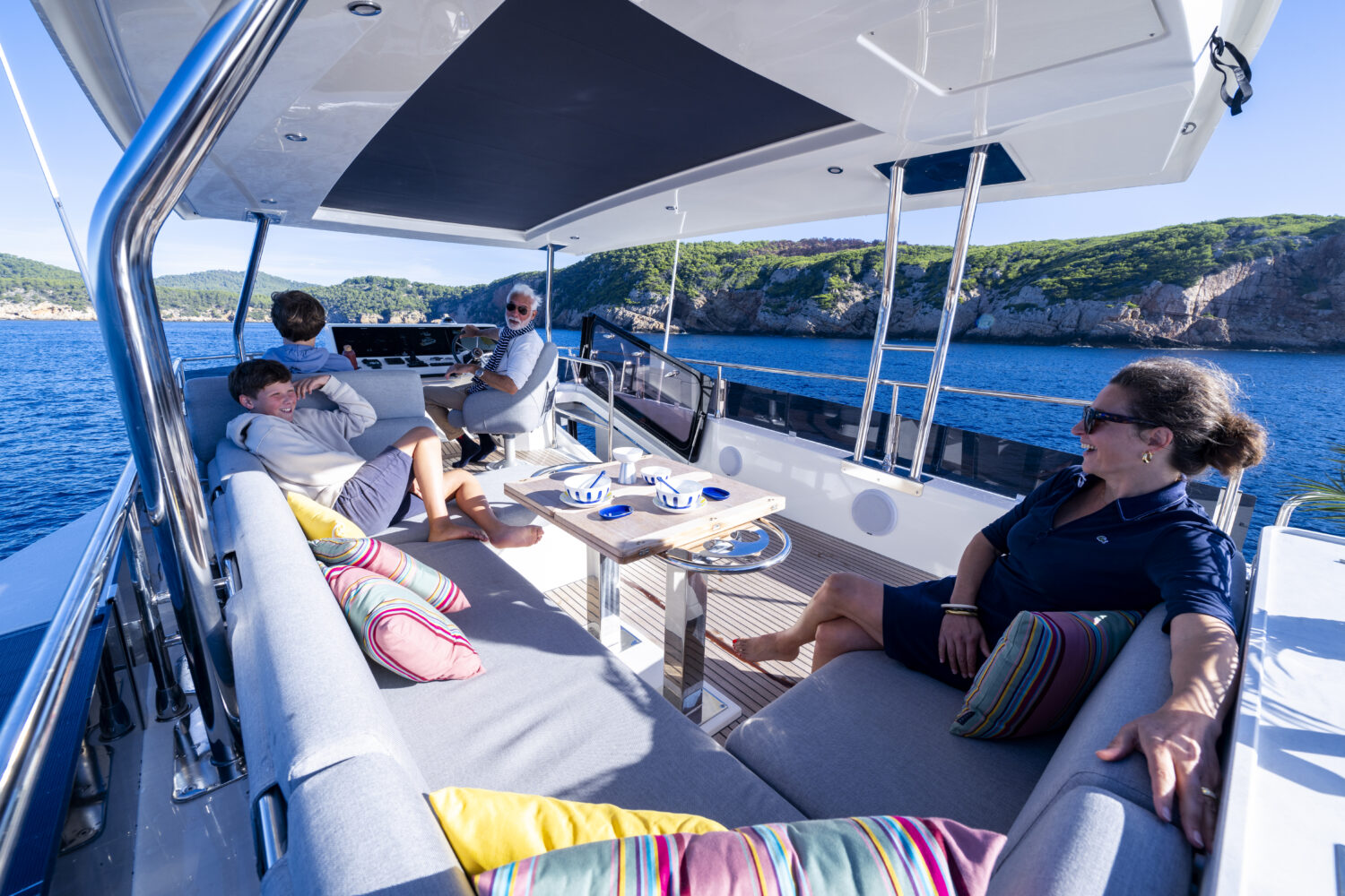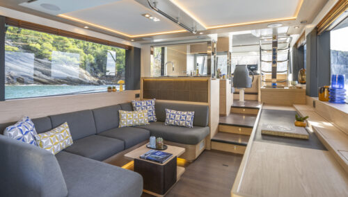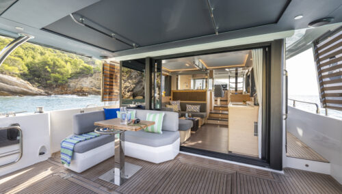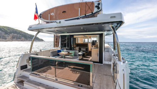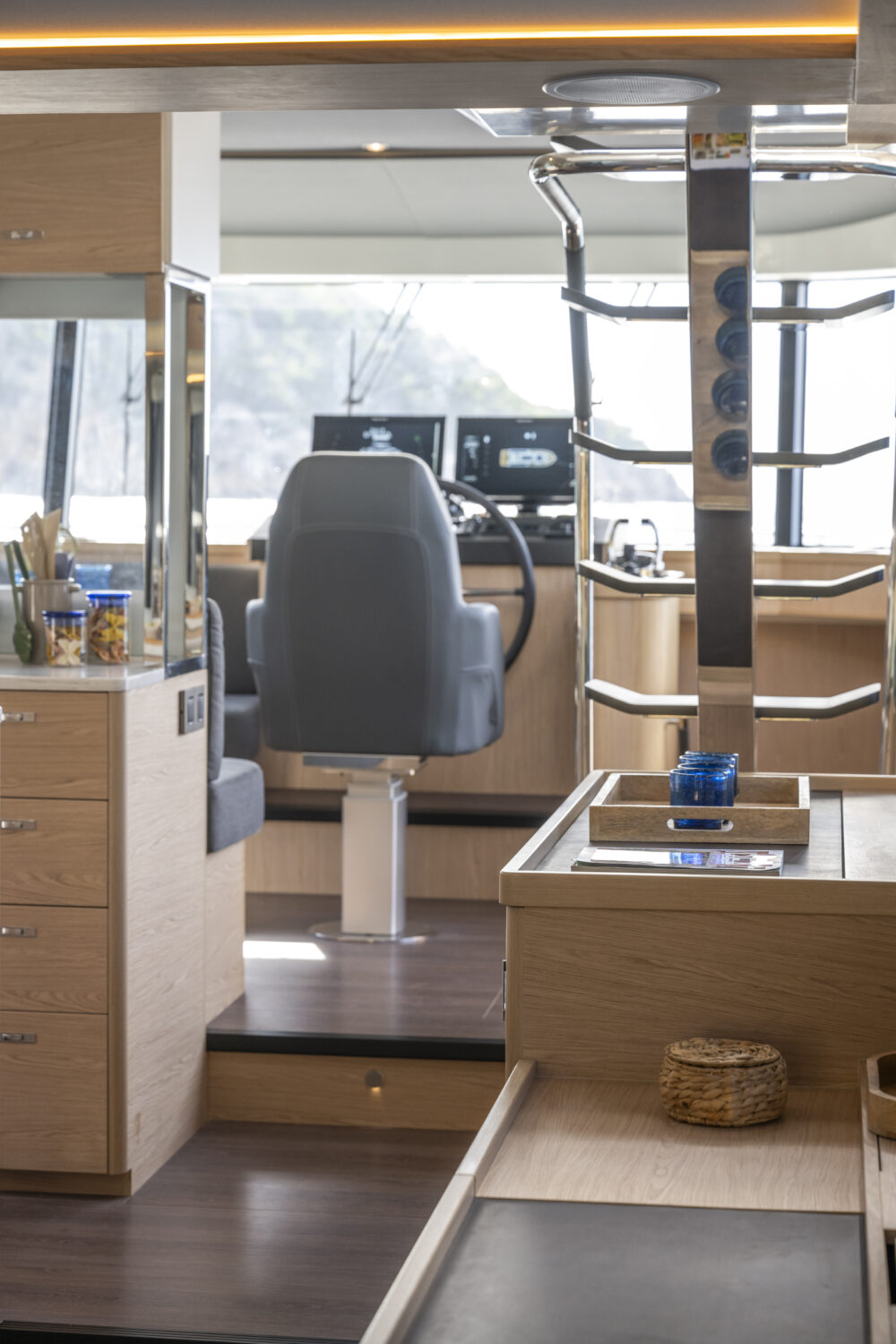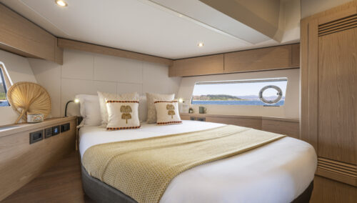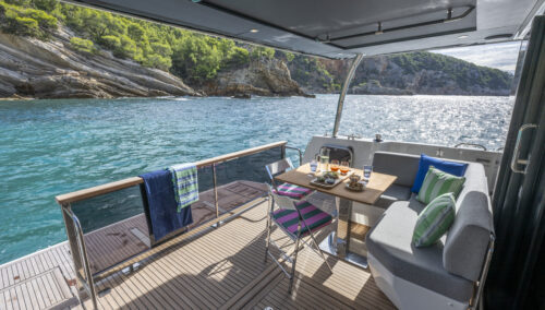 The visually stunning interior environment boasts a well-appointed galley with a raised passagemaker dinette, a large saloon and an attractive “architectural” flybridge stair. Built with six berths, with the option for an additional single crew berth, the layout is perfect for long family cruises. The separate shower cubicles feature Corian flooring with the addition of a rain shower in the ensuite of the full beam aft owner cabin.