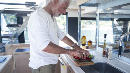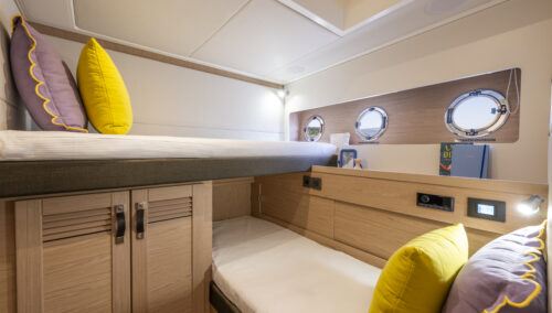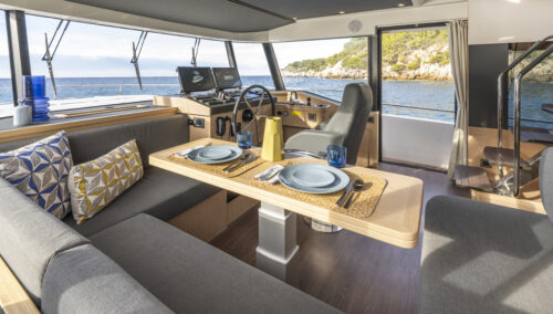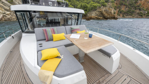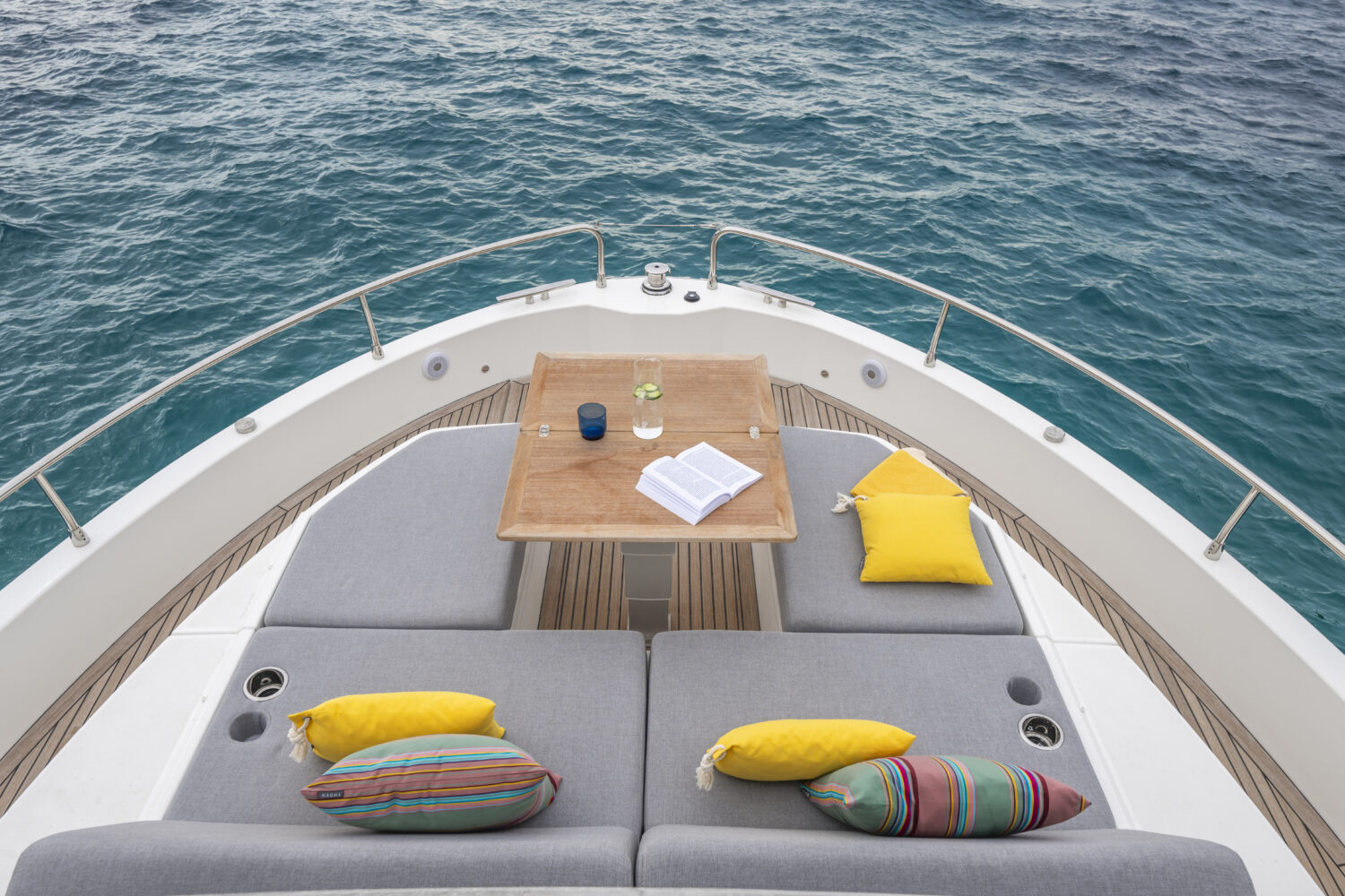 The innovative Swift Trawler 54 passagemaker includes a stunning cockpit and a spacious flybridge, all with soft seating and luxury touches. It offers a terrace to the sea. The stern boasts an 800lb tender lift, ample storage for kayaks and paddleboards and a hydraulic swim platform with adaptive dinghy chocks. On the foredeck, the U-shaped seating area with an inset table easily converts into a huge sunpad, with dedicated fender stowage underneath.