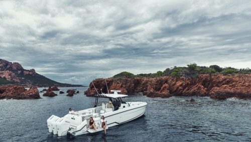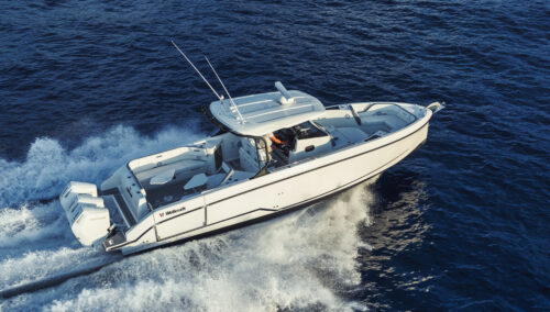 The Wellcraft 38 T-Top offers a safe, powerful, and dynamic driving experience. This offshore performer combines exceptional power with optimized weight, delivering unrivaled speed and agility. Equipped with the latest generation of twin and triple outboard engines, it can easily reach speeds up to 57mph (50knots). A strong focus on optimizing the three-seated helm console ensures the driver an ergonomic, intuitive, and immersive experience. The steering, throttles and hard buttons are ideally positioned for high-speed operation, while the twin 16” MFD screens offer comprehensive situational awareness.
