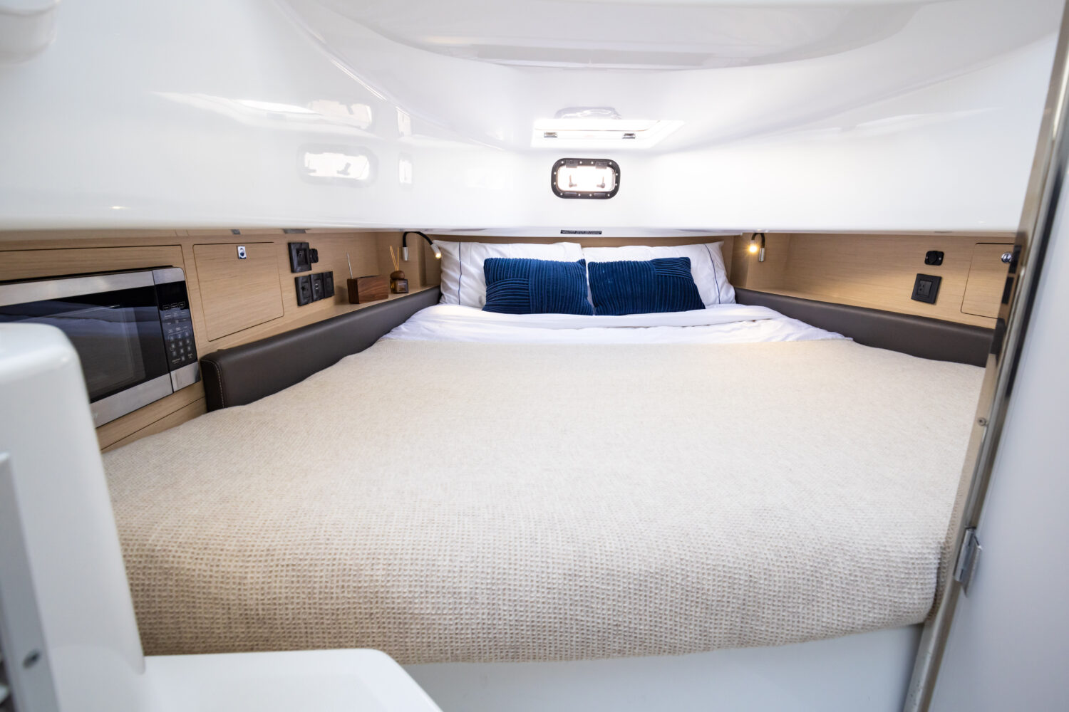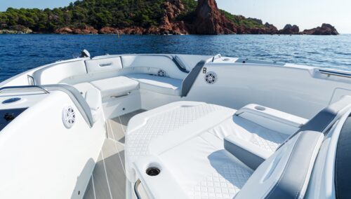 The wrap-around foredeck and comfortable C-shape seating provide a spacious dining area that enhances onboard social gatherings. It comes standard with the innovative table that can be lowered at the touch of a button to complete a sun pad or seamlessly integrate into the floor. This double-wide sun lounger provides additional comfort with integrated cup holders, armrests, and handholds, making it one of the best seats onboard.