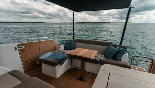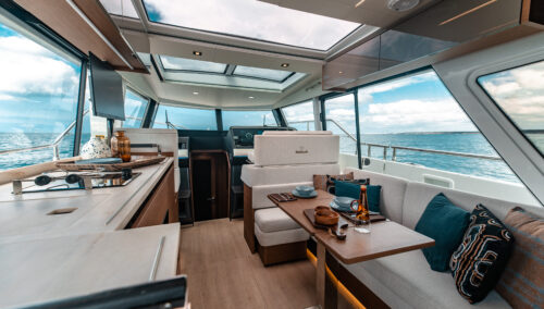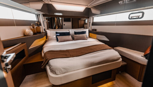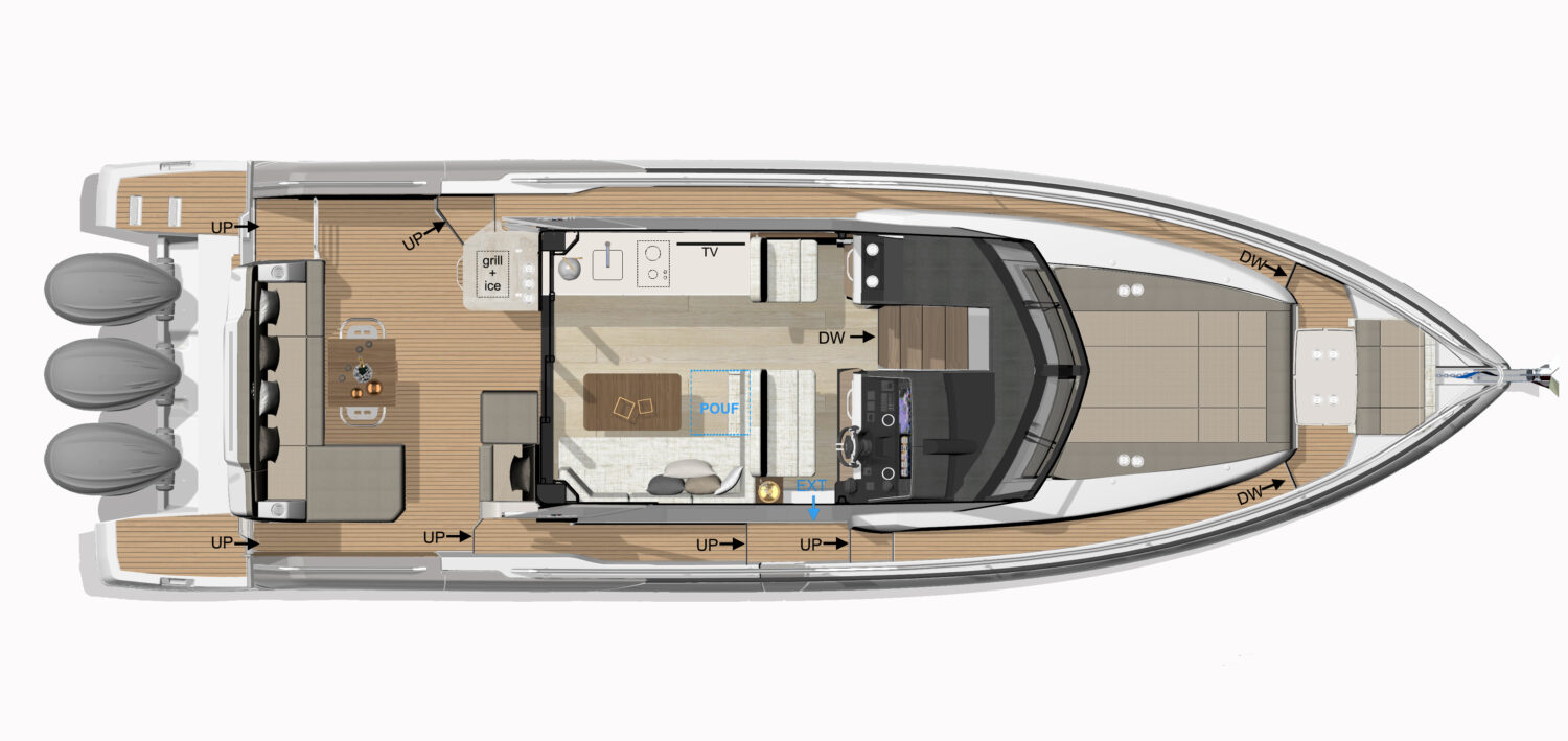 The Wellcraft 44 Explorer is designed to provide the ultimate in comfort and convenience. The high freeboard and starboard side door make life onboard easy and safe. The bow features two large social areas with a generous triple sun lounger and seating designed for entertaining, while the aft provides two comfortable lateral folding side terraces for a spacious open-air gathering area. Luxurious spacious interior crafted for luxurious comfort, the spacious living area and interior are sure to impress. High-quality materials used throughout the interior provide a comfortable onboard experience. The protected wheelhouse features pilot and copilot benches for three and a fully equipped galley at the deck level seamlessly connects the aft cockpit living space. Below deck are two spacious cabins with private bathrooms each having separate showers providing accommodations for up to five people. The Wellcraft 44 Explorer has an abundance of storage space to ensure everything is kept neat and organized, making it the ultimate boat for unforgettable adventures.